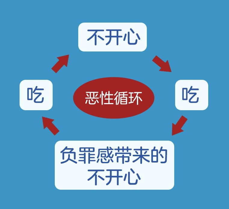 这种进食模式,对怕胖的小伙伴来说很麻烦,因为可能会陷入因负面情绪而吃,吃完了又会产生负罪感等新的负面情绪,于是又想要靠吃来缓解的恶性循环。